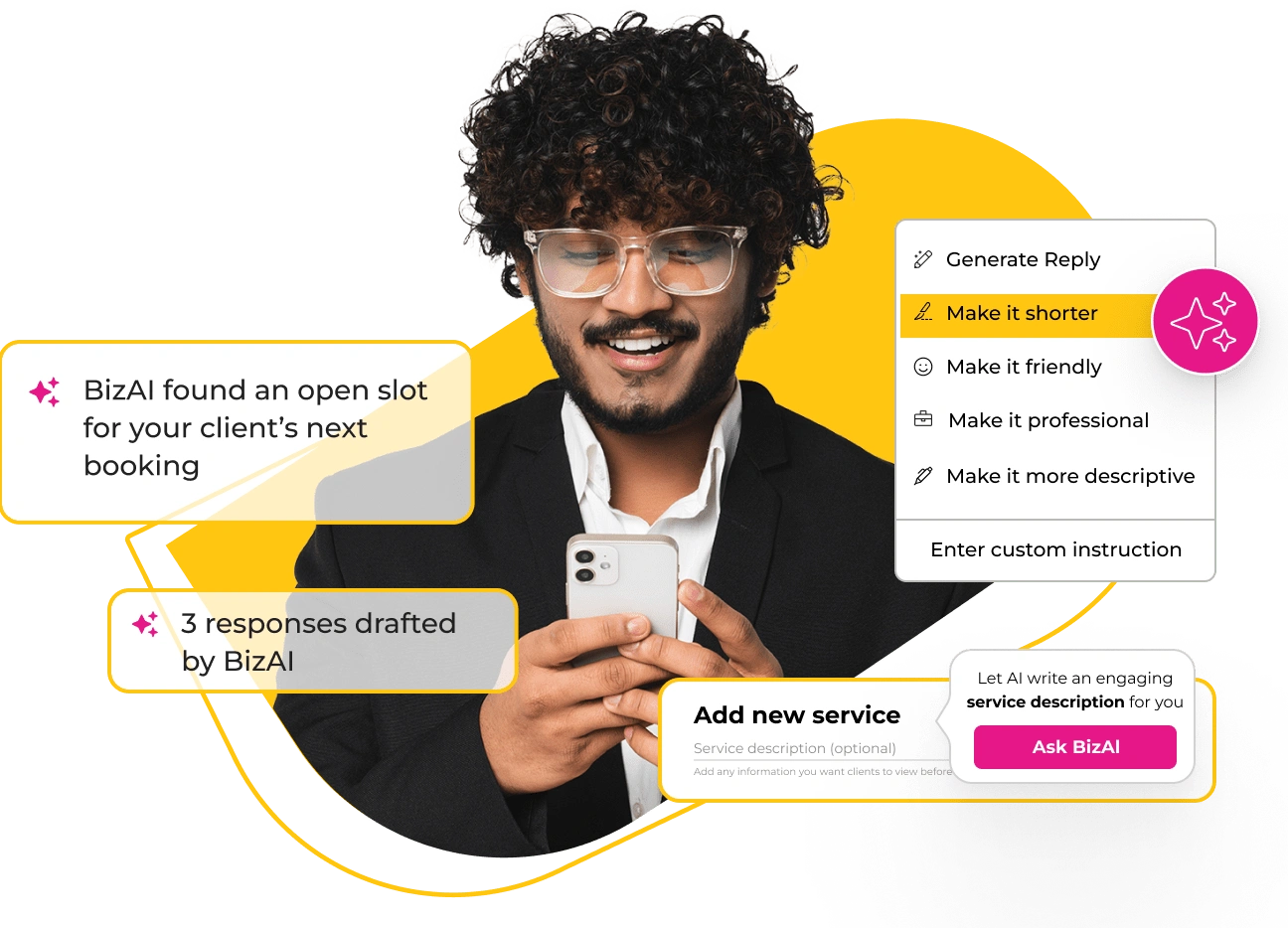 – AI Receptionist and Embedded – BizAI automation built into the daily SMB workflow (AI Reply, Scheduling & Estimates) and Content generation