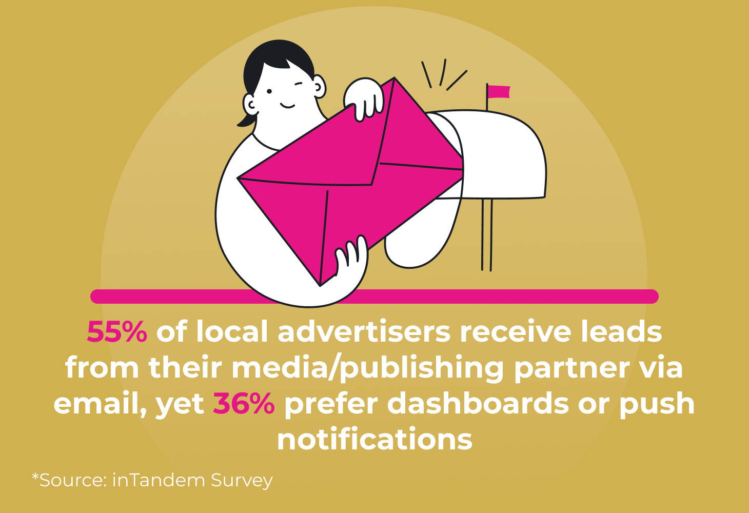 Considering that, it makes sense that about 36% of local advertisers said they’d rather receive leads through dashboards or push notifications that notify them instantly and enable immediate action. Delivering leads via email is no longer enough for a media or publishing company looking to thrive. They need to think about more proactive and efficient ways to provide those leads and ensure conversions.